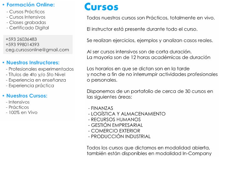 Le interesa un tema en particular, contáctenos por Whatsapp +593 998014393 o al E-Mail: ceg.cursosonline@gmail.com Aceptamos su Tarjeta de Crédito a través de PayPal